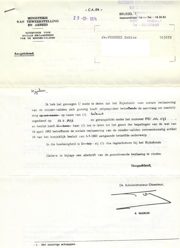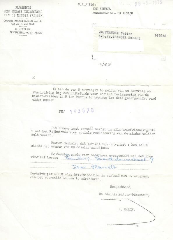 In mei dienden mijn ouders een aanvraag in tot inschrijving bij het Rijksfonds voor sociale reclassering van minder-validen.